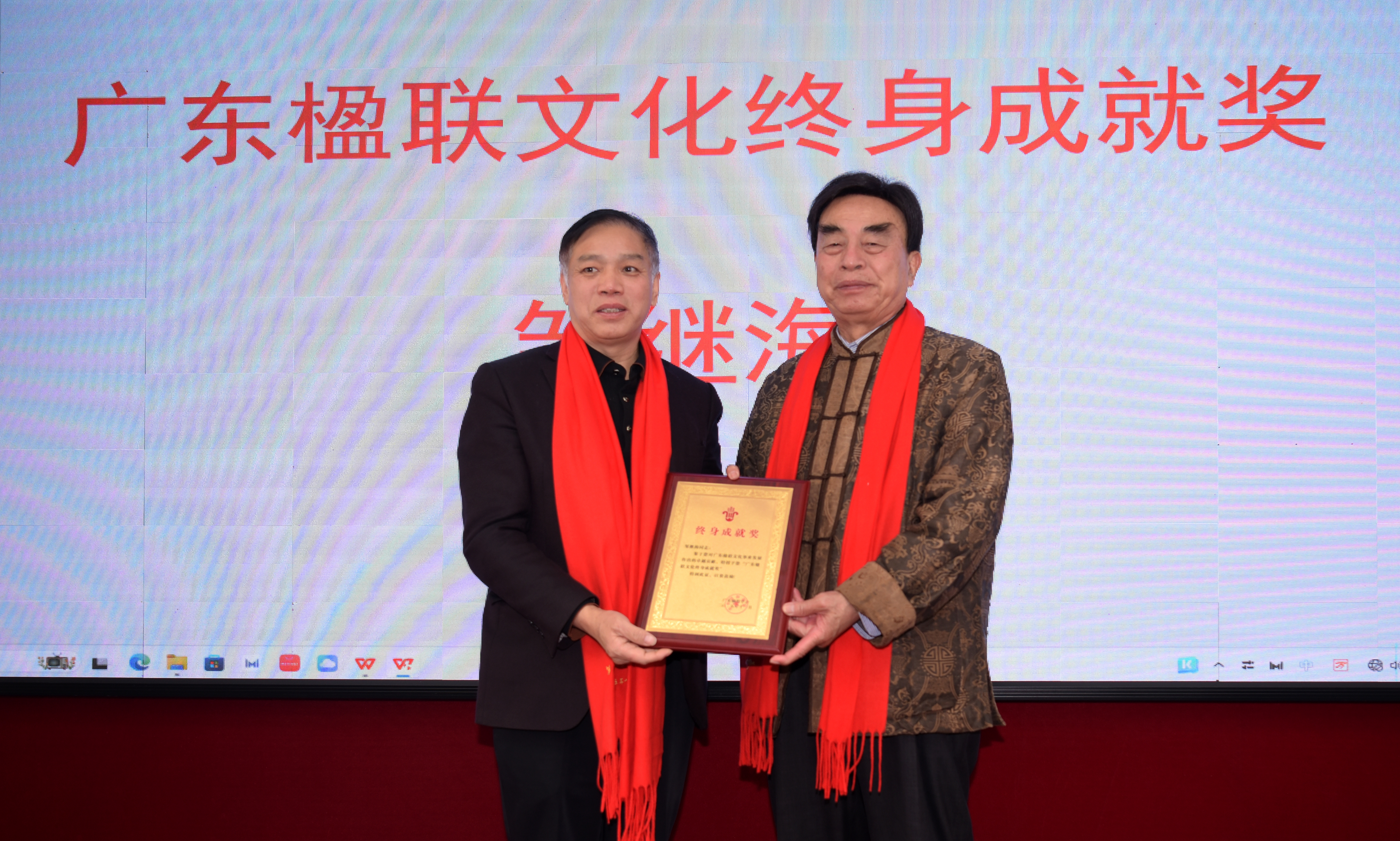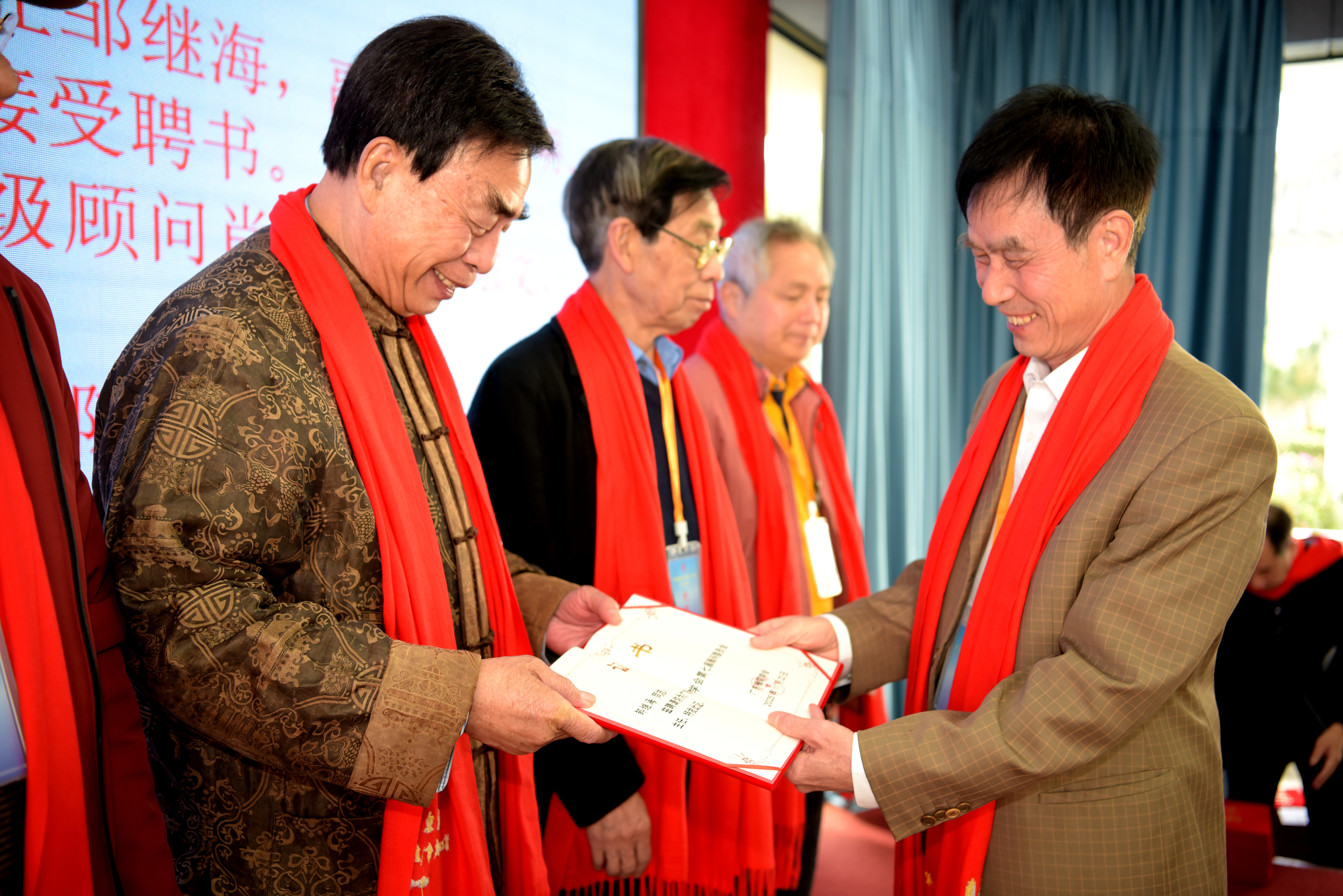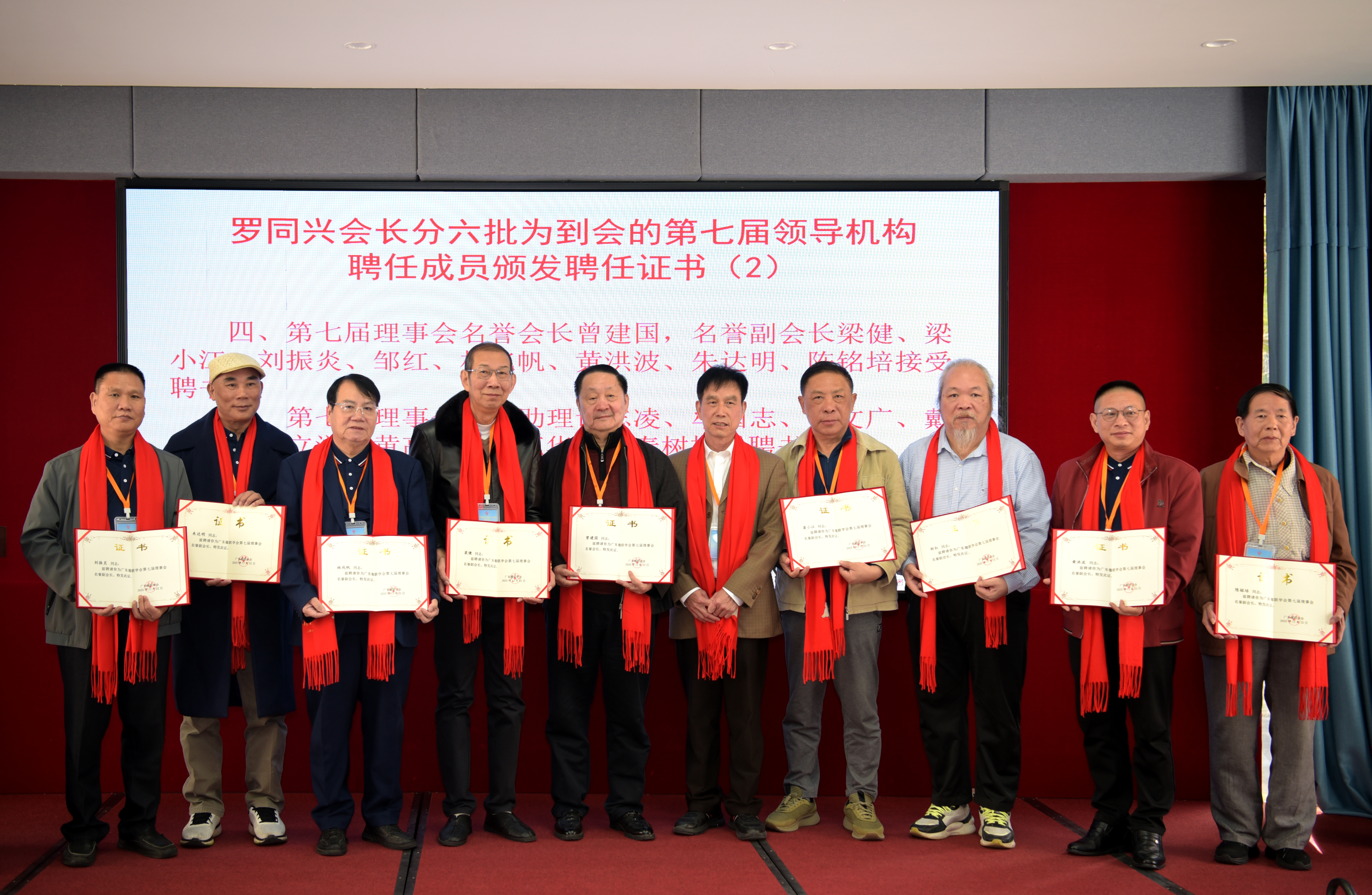 大会宣布广东楹联学会第七届理事会聘任邹继海为顾委会主任,聘请孙幼明、容启东、康斯馨、钟宝胜、黄淦波为顾委会副主任,罗同兴会长为他们颁发了证书;