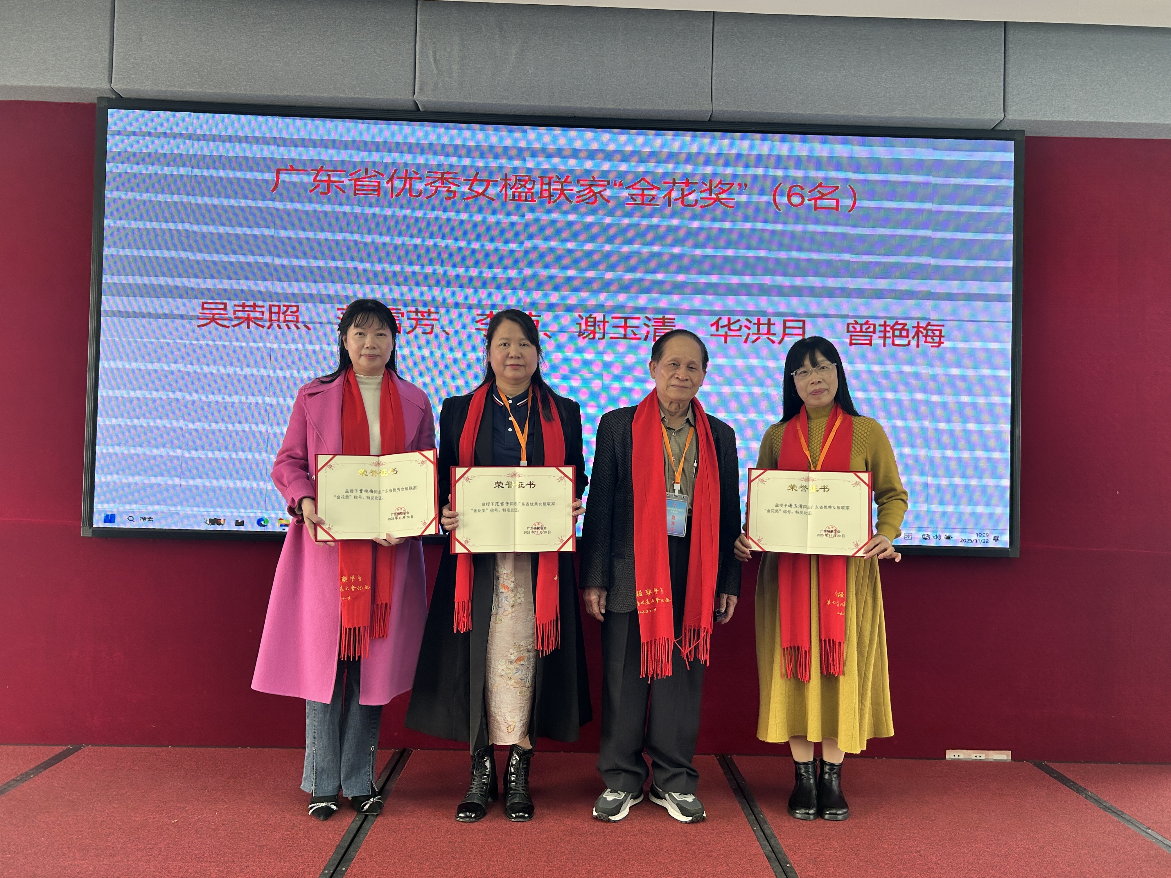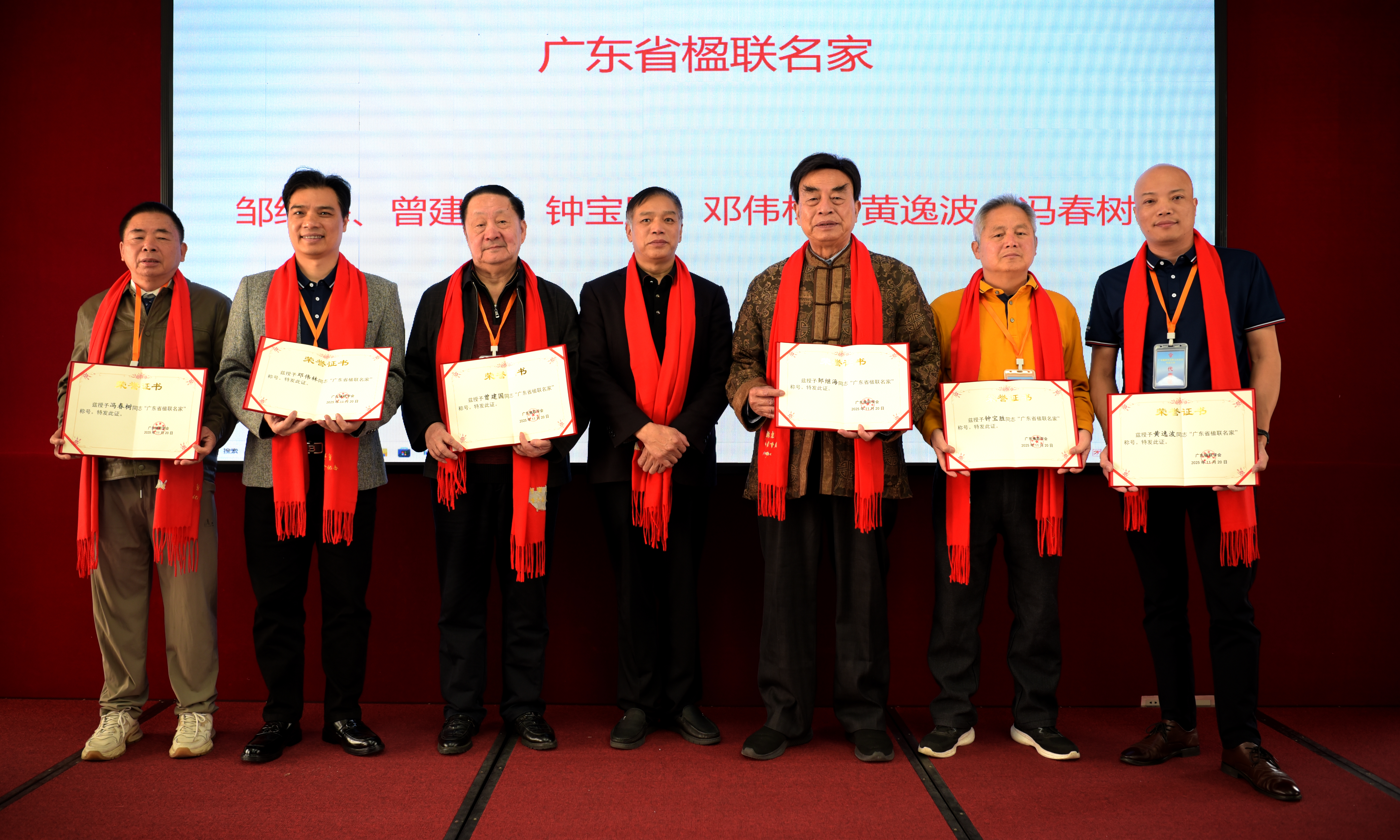 授予许志凌等106人“广东省楹联事业先进工作者”称号;授予吴荣照、范雪芳、李菊、谢玉清、华洪月、曾艳梅等6人广东省优秀女楹联家“金花奖”。授予康斯馨、罗承芳、陈济源、陆桂昌、梁国均、梁永兴、黄岳林、陈奋等8人“广东省联坛十老”称号;授予邹继海、曾建国、钟宝胜、邓伟林、黄逸波、刘枫、冯春树、黄德存、莫心义、王衍、陆桂昌、万广明、冯燮涛等13人“广东省楹联名家”称号。