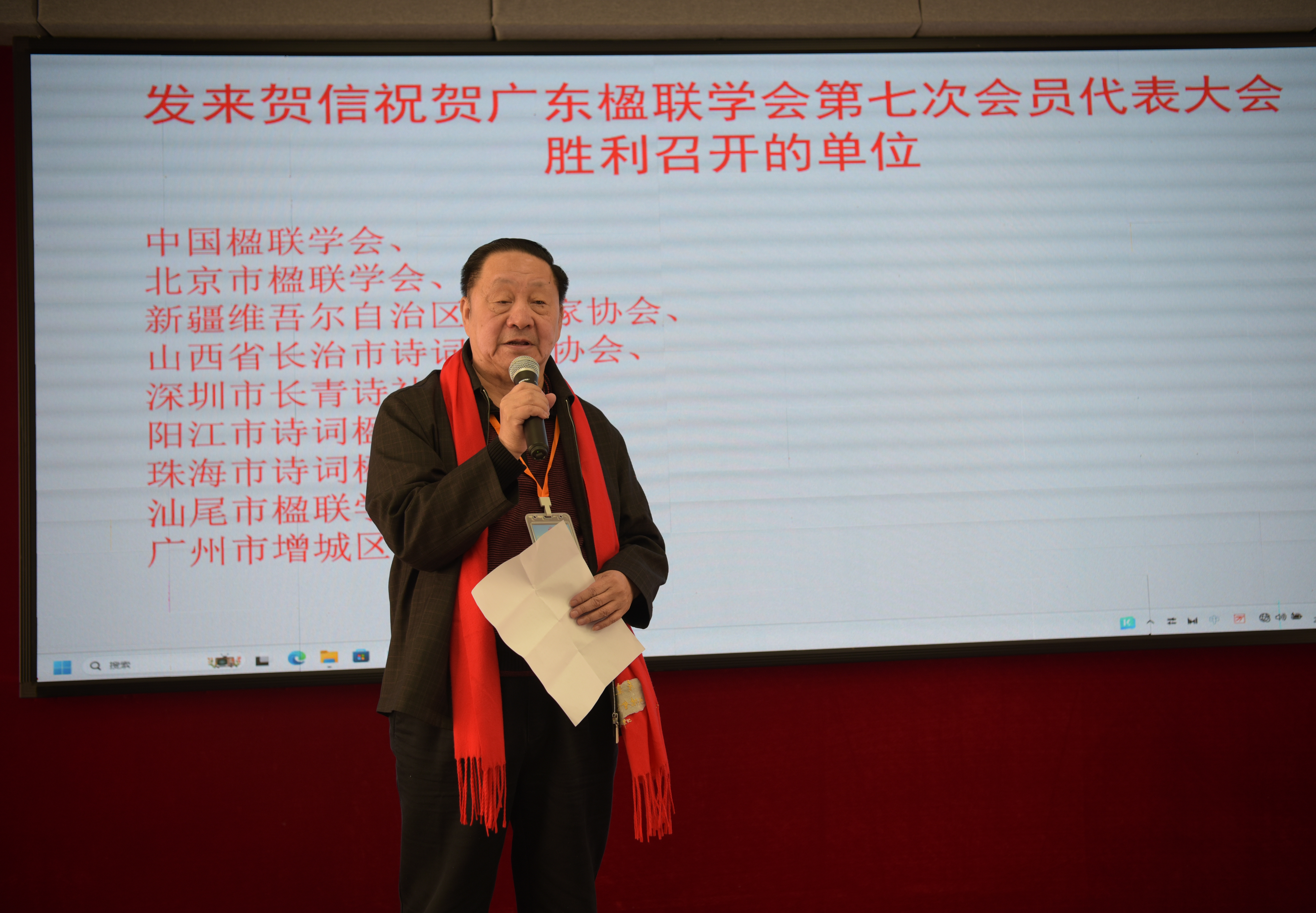 随后,左万青宣读全国发来贺信的单位名单。曾建国宣读了中国楹联学会的贺信。广东楹联学会副会长邓伟林宣读了感谢信,对支持协办本次大会的单位和个人表示鸣谢。