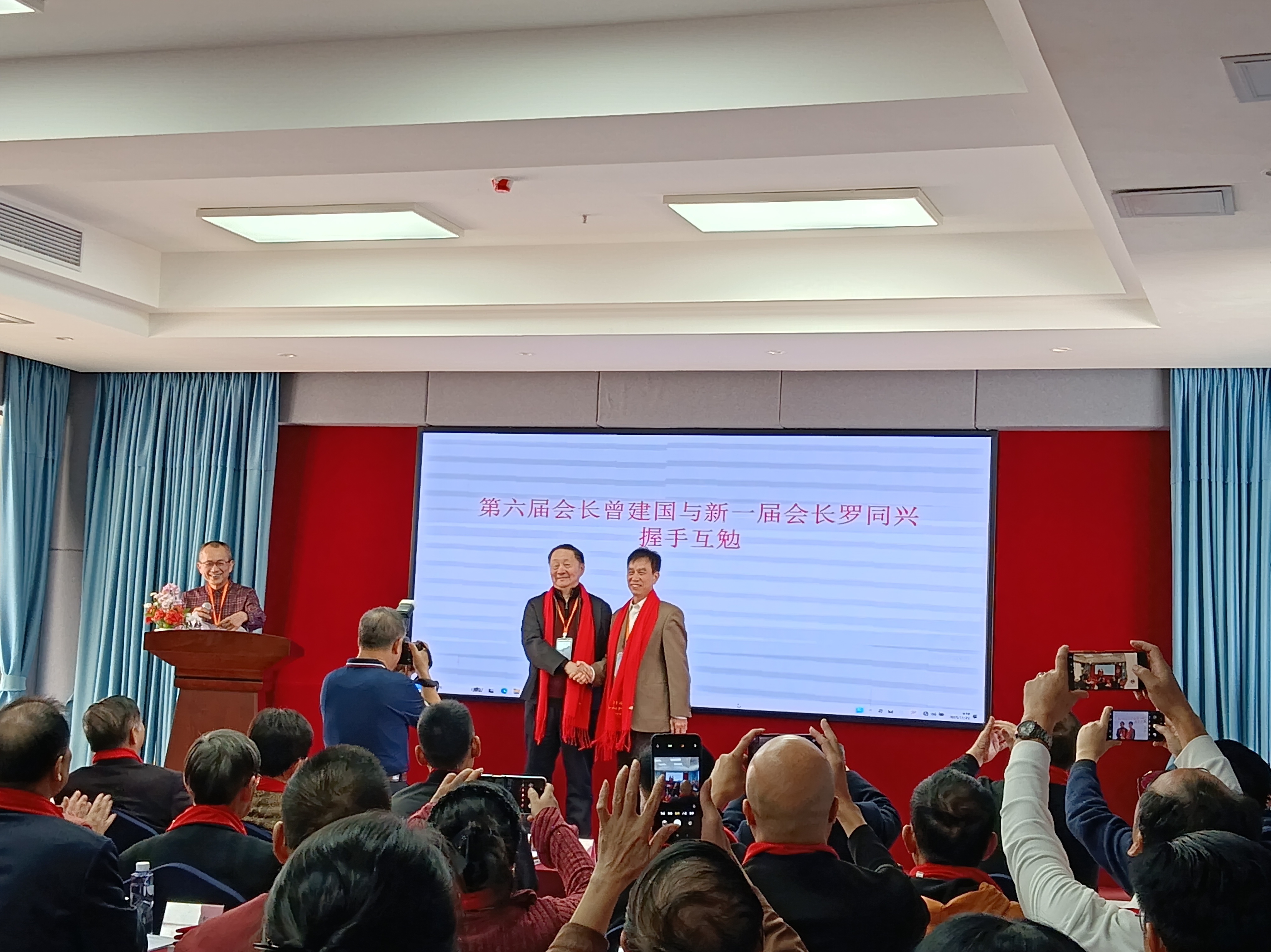 会上,曾建国同志宣读了新当选的广东楹联学会第七届领导班子名单,中国楹联学会会长肖良平亲自为新当选的广东楹联学会第七届会长罗同兴同志颁发任命证书。之后,罗同兴为第七届副会长颁发任命证书。在全场热烈的掌声中,曾建国与罗同兴新老会长握手互勉。